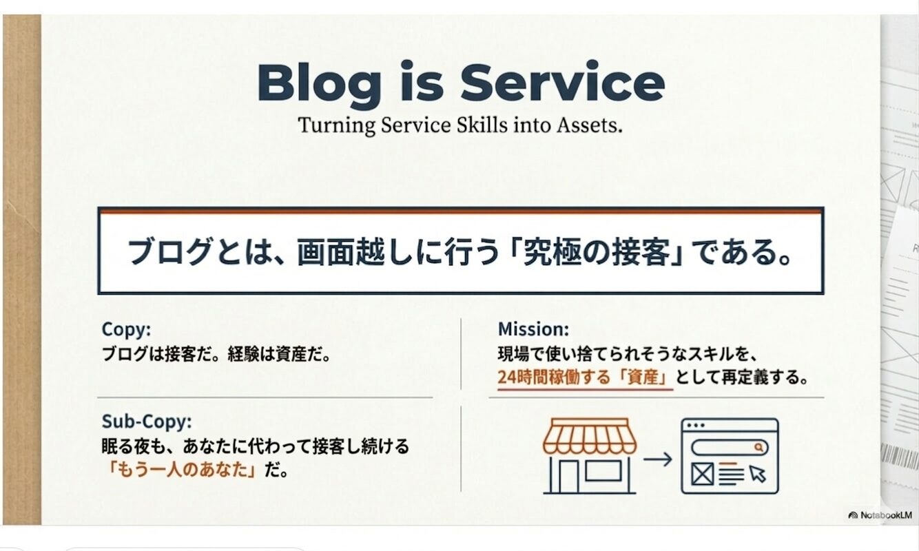 あなたが今日経験した悔しさも、現場で磨いた誰にも負けない気配りも、実はインターネット上に「自分の店(ブログ)」を作るための最高の材料になります。