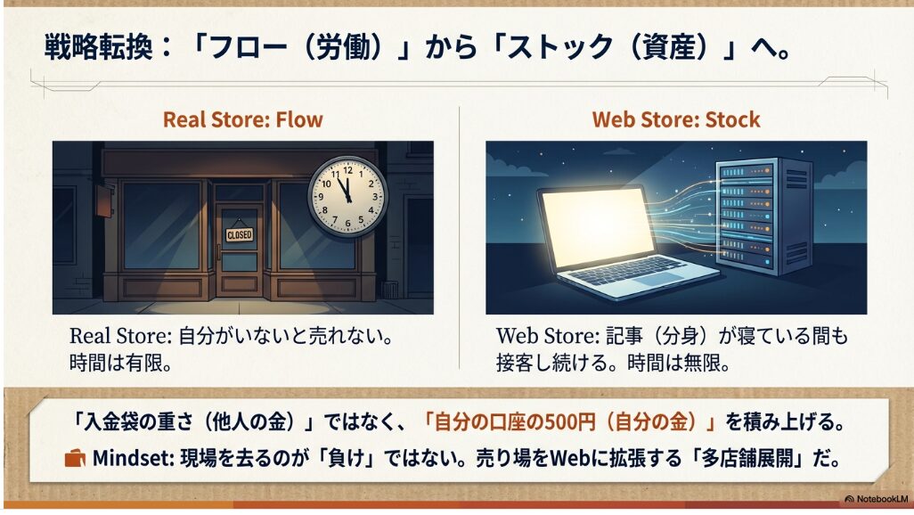 この記事では、販売業の苦しさを「転職」で逃がすのではなく、「Web資産」という形に変えて、自分の人生を取り戻すための逆転の発想をお伝えします。