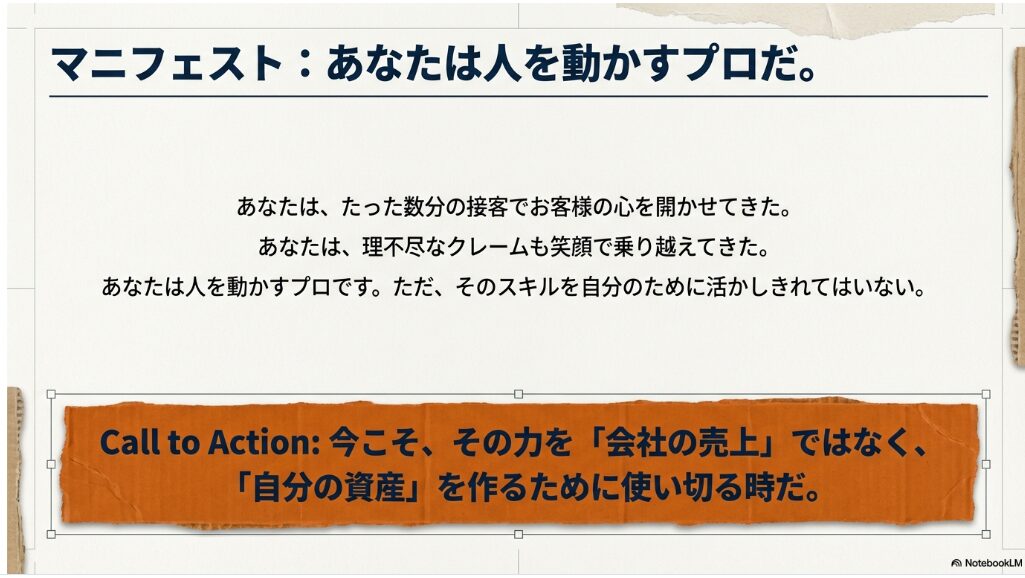 会社という箱を飛び出しても、あなた自身が「一人の店主」として価値を発揮し続けるために。今すぐ着手すべき「接客経験の資産化」の具体的なステップを、こちらにまとめました。